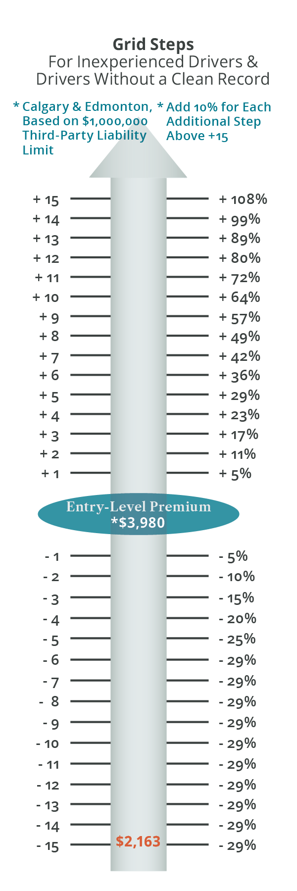 New and less experienced drivers with driver training start at 10 per cent below the base rate, or entry-level premium (Grid step -2). Their rate can also decrease as they gain experience and drive without claims or convictions.